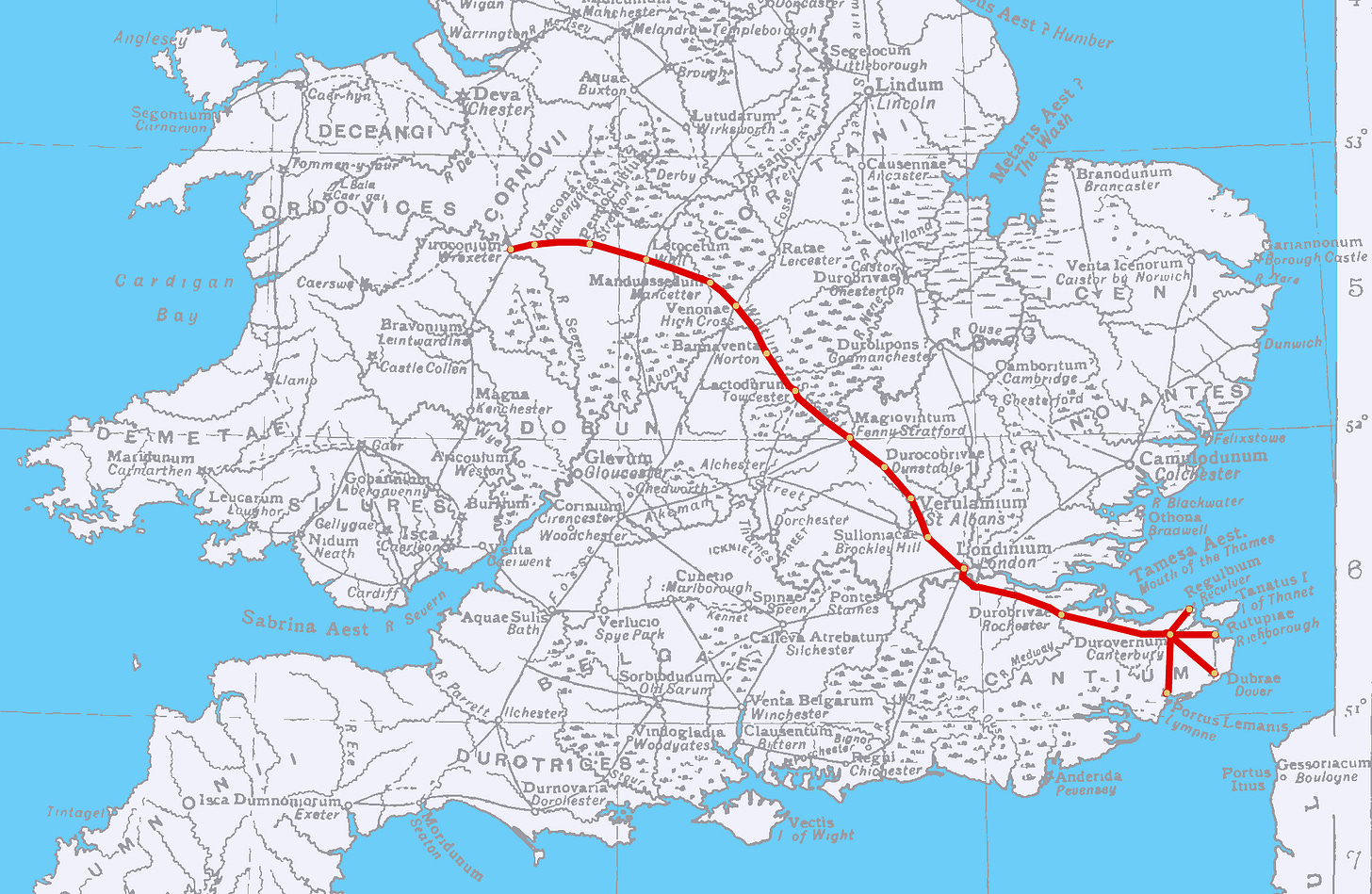The most famous of these ancient lines is known as Watling Street, first traced by those early Britons, later adopted and paved by Romans to move their troops and supplies. It runs, in fragments and continuities, through the entire spine of our landscape.
