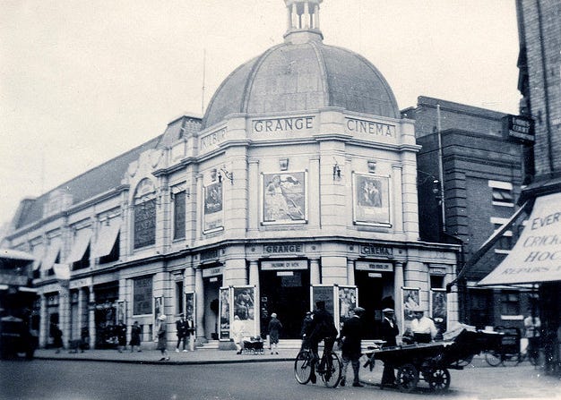 Oswald Stoll, a showman of considerable ambition, bought the estate intending to build a grand theatre to rival his London Coliseum in St Martin’s Lane, near Leicester Square. Progress overtook him, and instead the 2,312 seat Grange Cinema opened on 30 July 1914 which remained the largest in Kilburn for a couple of decades before the Gaumont State overtook it to be the largest cinema in Europe with 4,000 seats.
