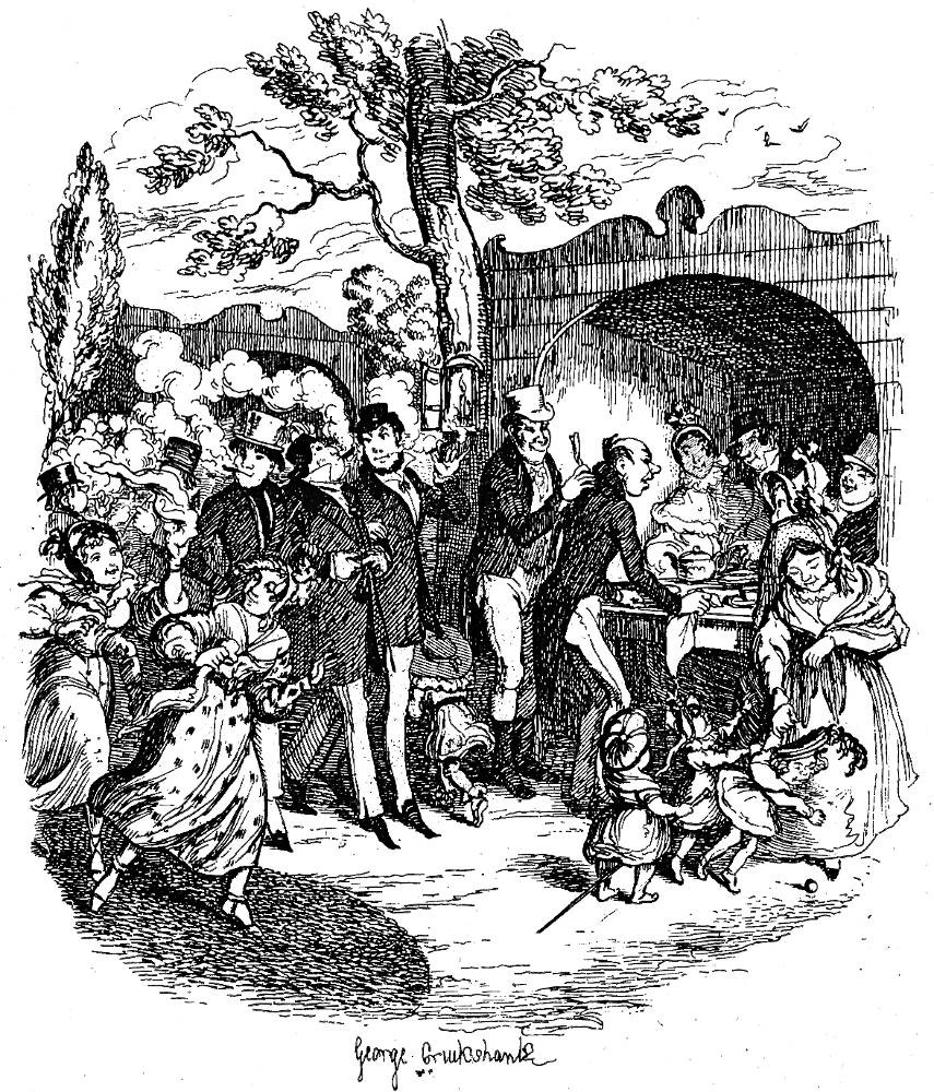 The heat is intense this afternoon….. What a dust and noise! Men and women — boys and girls — sweethearts and married people — babies in arms, and children in chaises — pipes and shrimps— cigars and periwinkles — tea and tobacco. Gentlemen, in alarmingwaistcoats, and steel watch-guards, promenading about, three abreast, with surprisingdignity …… — ladies, with great, long, white pocket-handkerchiefs like smalltable-cloths, in their hands, chasing one another on the grass in the most playful andinteresting manner, with the view of attracting the attention of the aforesaid gentlemen— husbands in perspective ordering bottles of ginger-beer for the objects of their affections, with a lavish disregard of expense; and the said objects washing down huge quantities of “shrimps” and “winkles,” with an equal disregard of their own bodily health and subsequent comfort — boys, with great silk hats just balanced on the top oftheir heads, smoking cigars, and trying to look as if they liked them — gentlemen in pink shirts and blue waistcoats, occasionally upsetting either themselves, or somebodyelse, with their own canes.