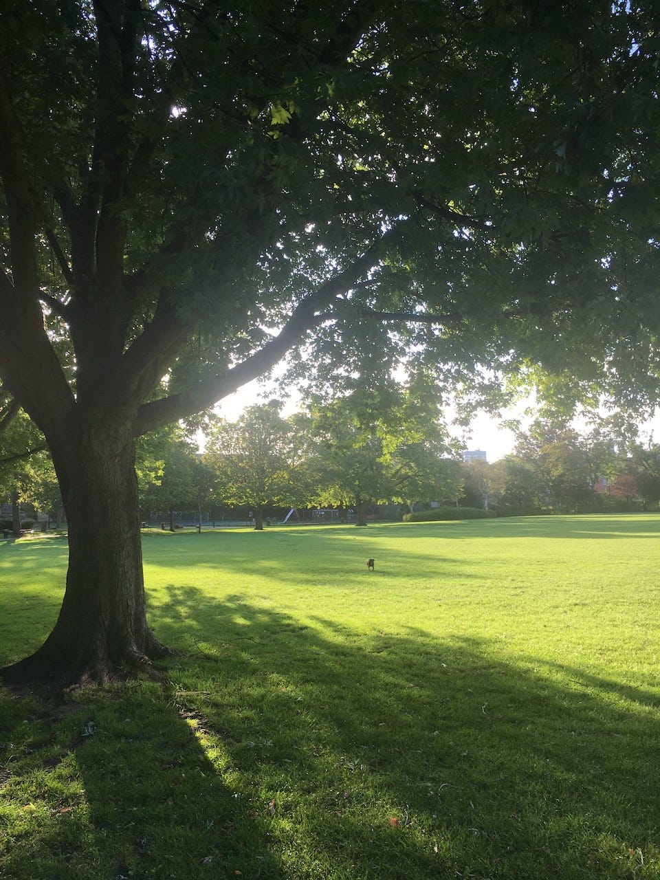 The sweetness of that morning Sun on our faces when She arrives. Habibi and I linger strategically in that sweet spot located near the basketball courts, in the far-top corner of the green. Whether spring, summer, autumn or winter, this is the miracle spot where we receive the long rays of golden kisses that have travelled ninety-three million miles in such a hurry to reach our upturned faces, that they raced through the heavens in under nine minutes. There have been days when it’s taken me longer to remember where I was.